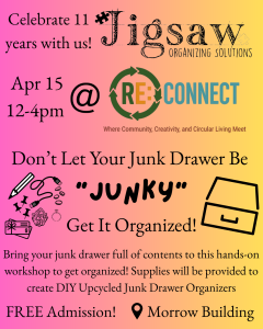 April 15 @ 12:00 PM - 4:00 PMGet your junk drawer organized at the RE:Connect event on April 15, 12-4pm. Free admission! Bring yo...